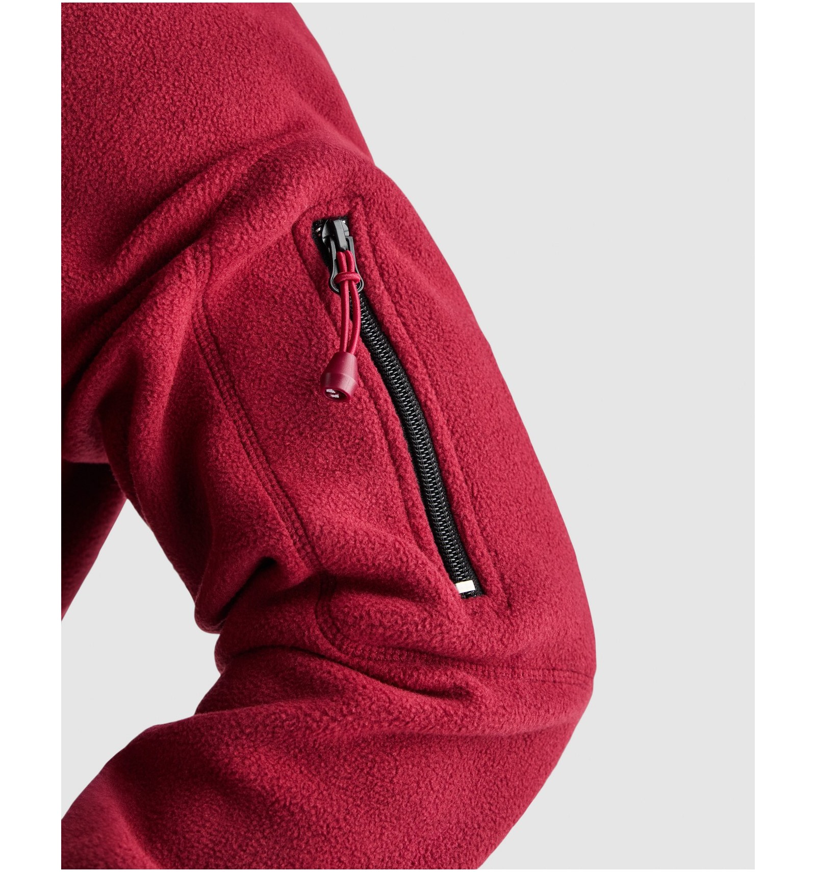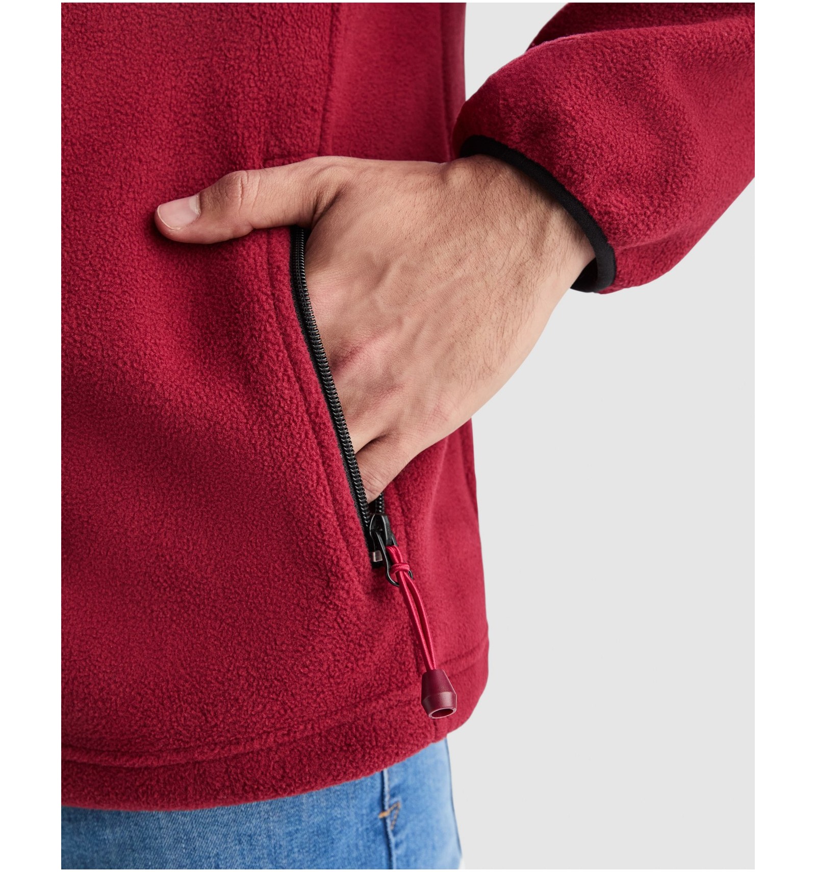 Fermoar central și buzunar pe mâneca stângă cu fermoar, ambele în contrast de culoare.