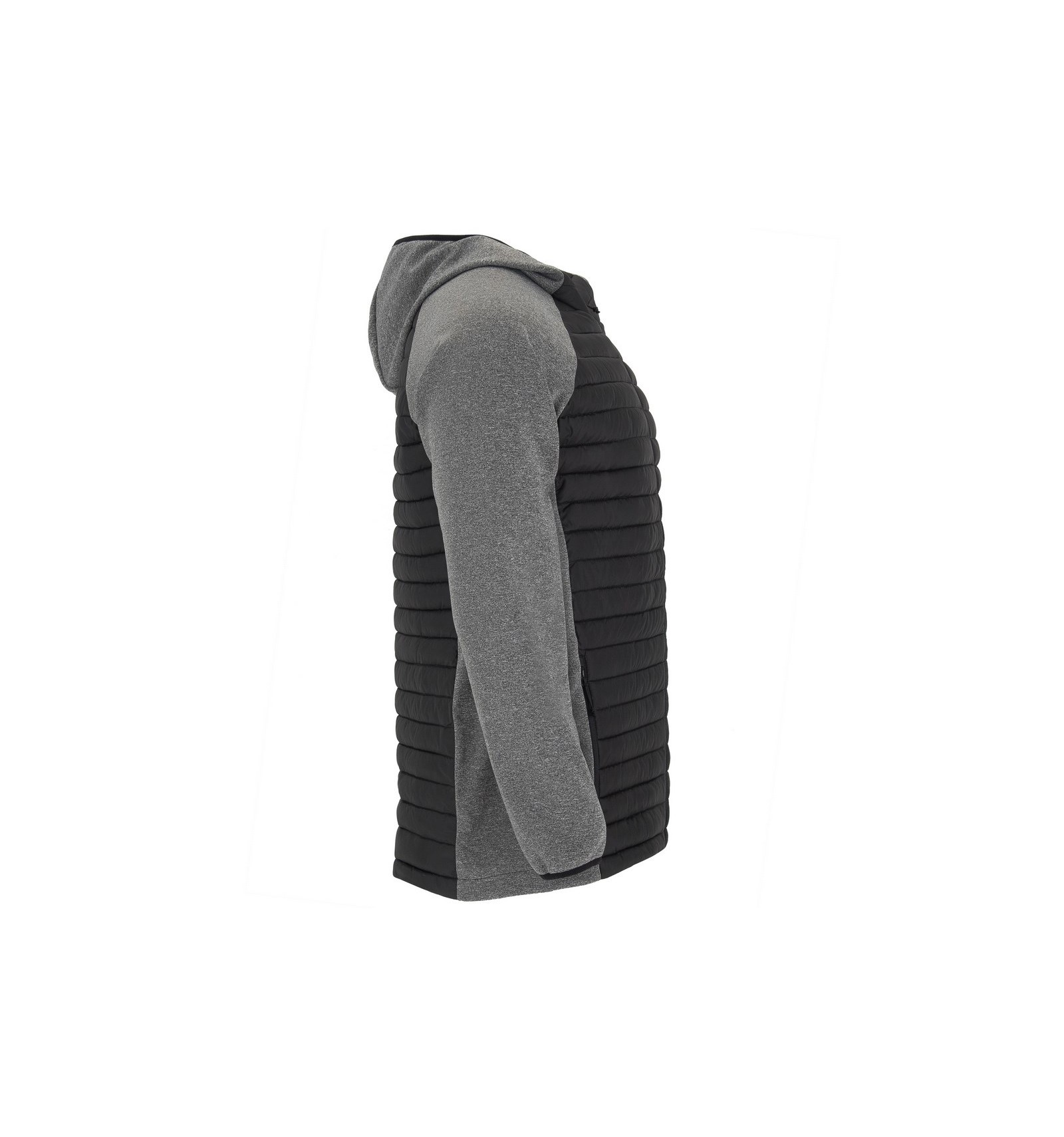 Jachetă de bărbați confecționată din două tipuri de material: 1. Glugă fixă. 2. Mânecă raglan. 3. Mânecile, panelele laterale și gluga din softshell. 4. Partea din față și din spate matlasate cu umplutură tact pene. 5. Fermoar inversat cu protecție pentru bărbie și cheiță. 6. Două buzunare în față, cu fermoar. 7. Margine elastică de aceeași culoare la guler, manșete și în talie.