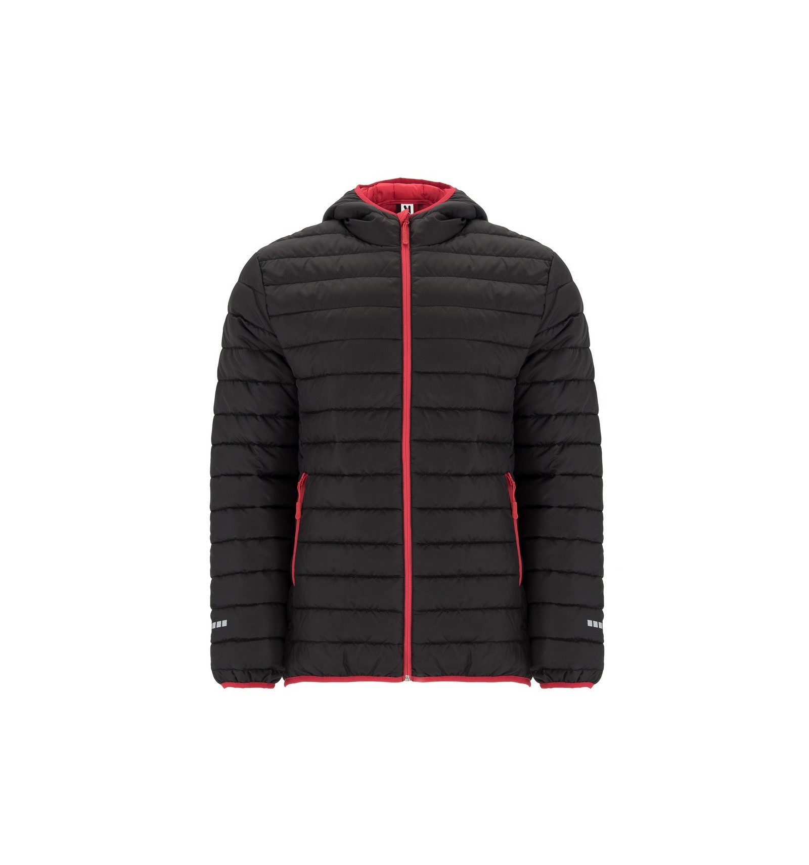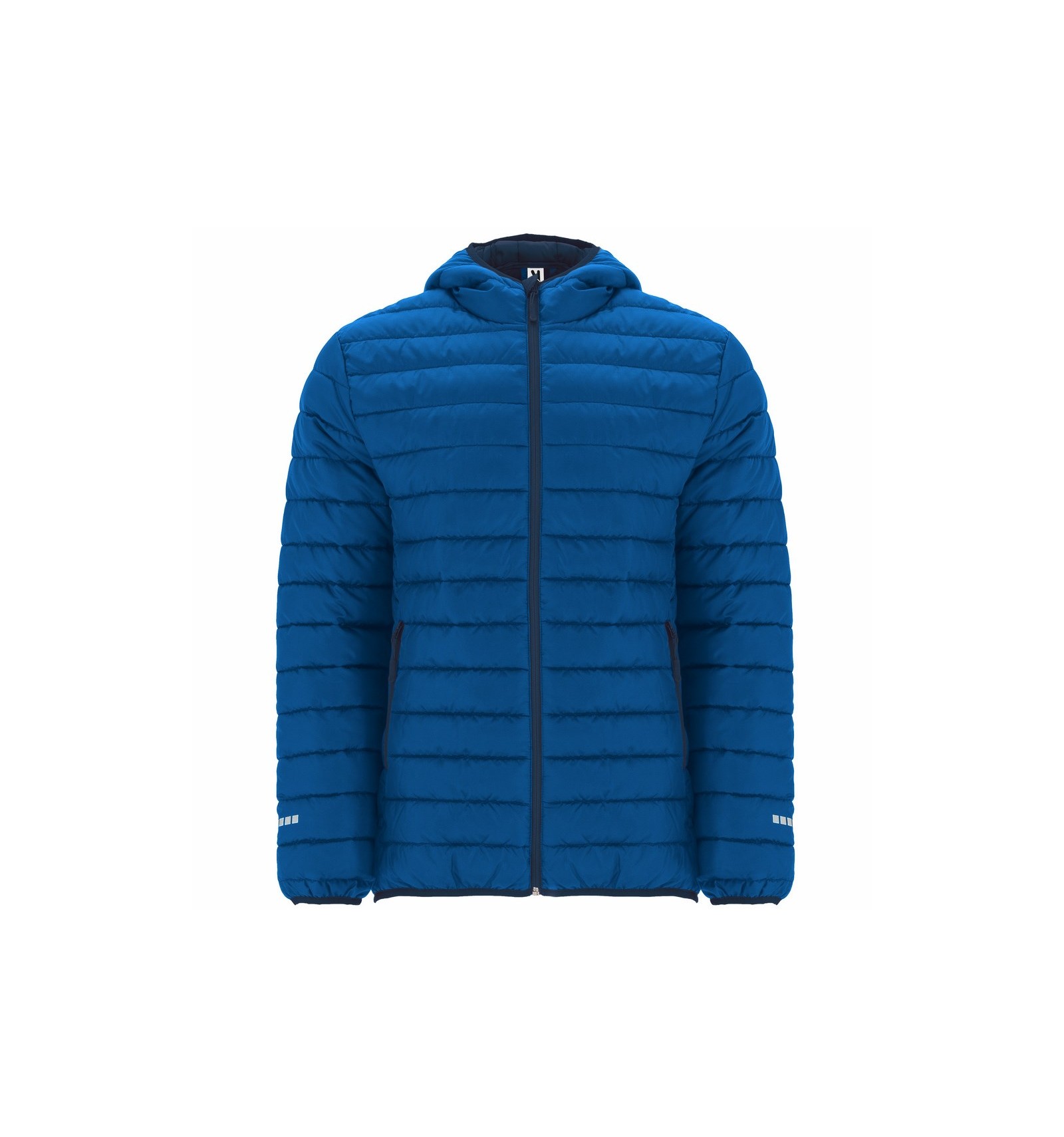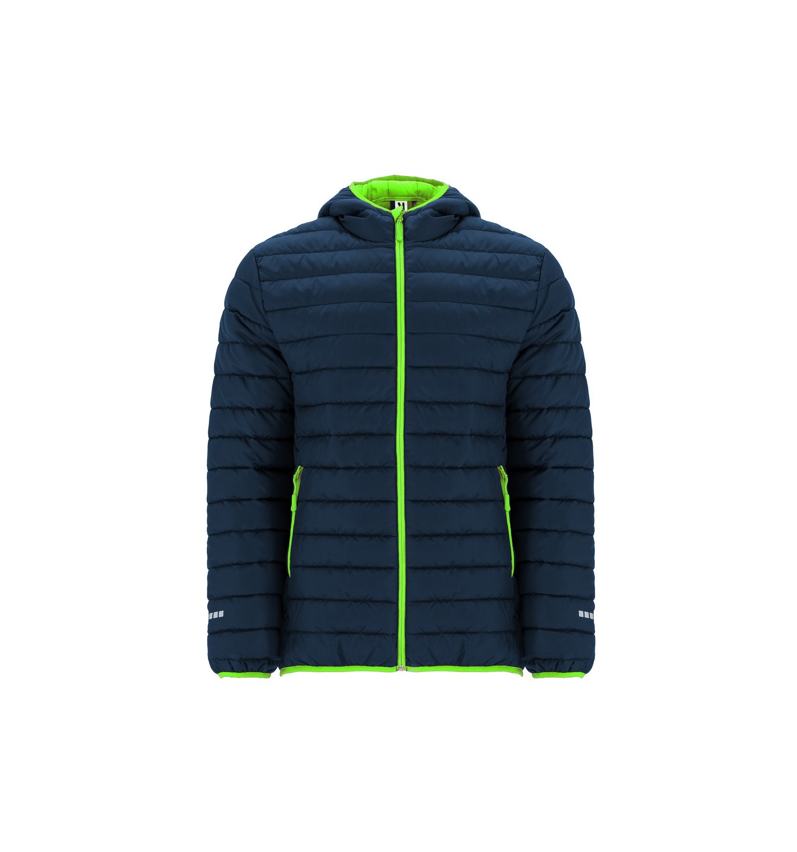 Jachetă sport, matlasată cu umplutură tact pene. 1.- Fermoar inversat cu protector pentru bărbie și cheiță. 2. Glugă fixă. 3. Buzunare laterale în contrast de culoare și cu fermoar inversat și cheiță. 4. Elemente reflectorizante pe mâneci și la spate. 5. 4 cm mai lungă în talie decât modelul NORWAY. 6. Glugă, manșete și talie cu margine elastică în contrast de culoare. 7. Include sac pentru depozitare.