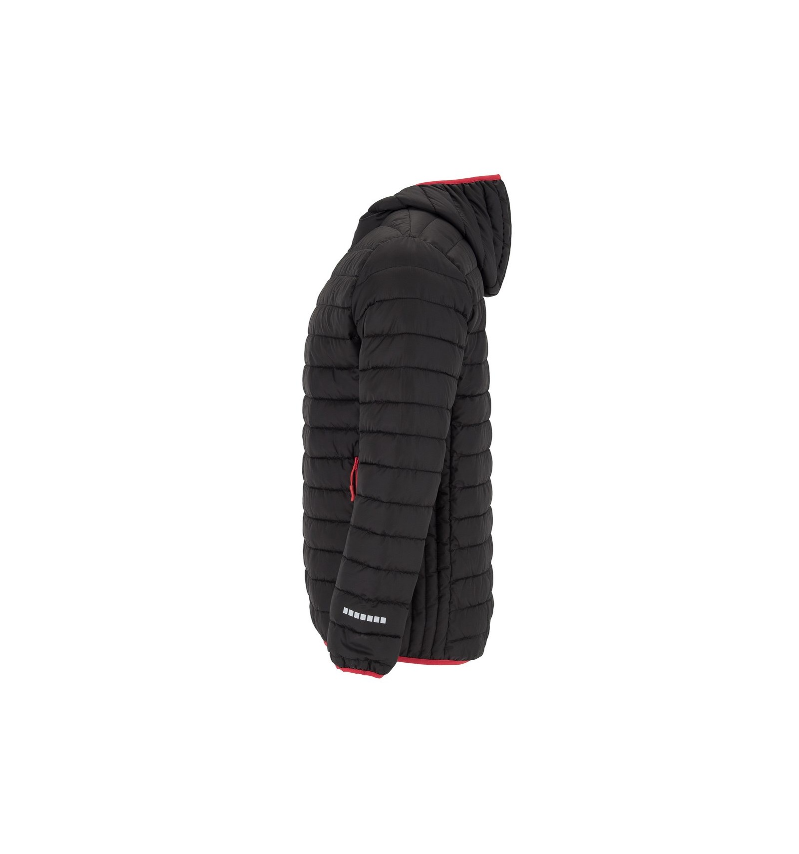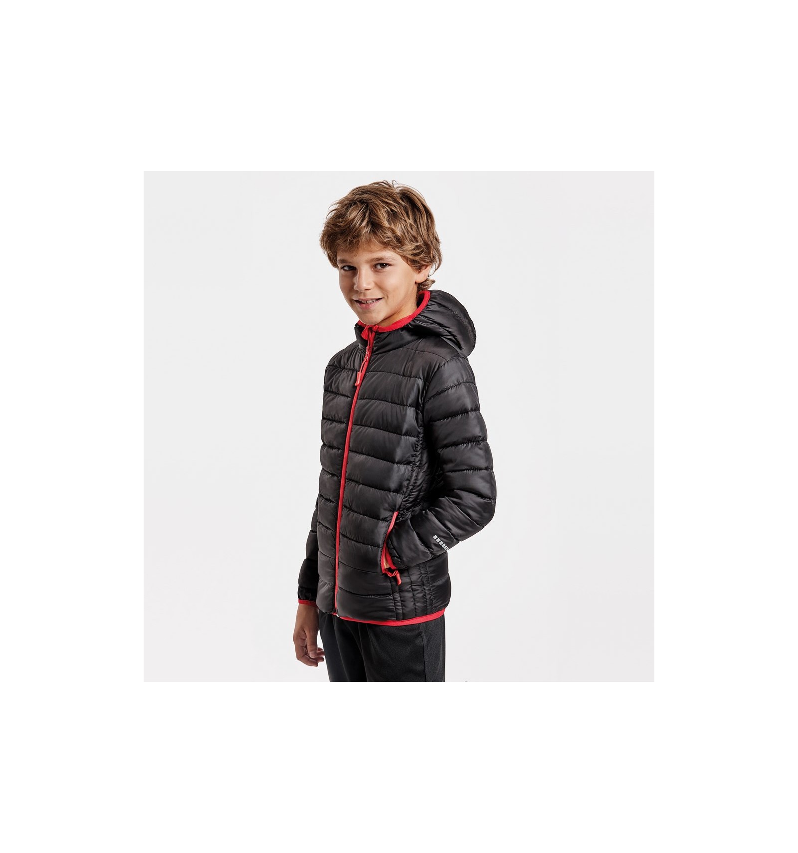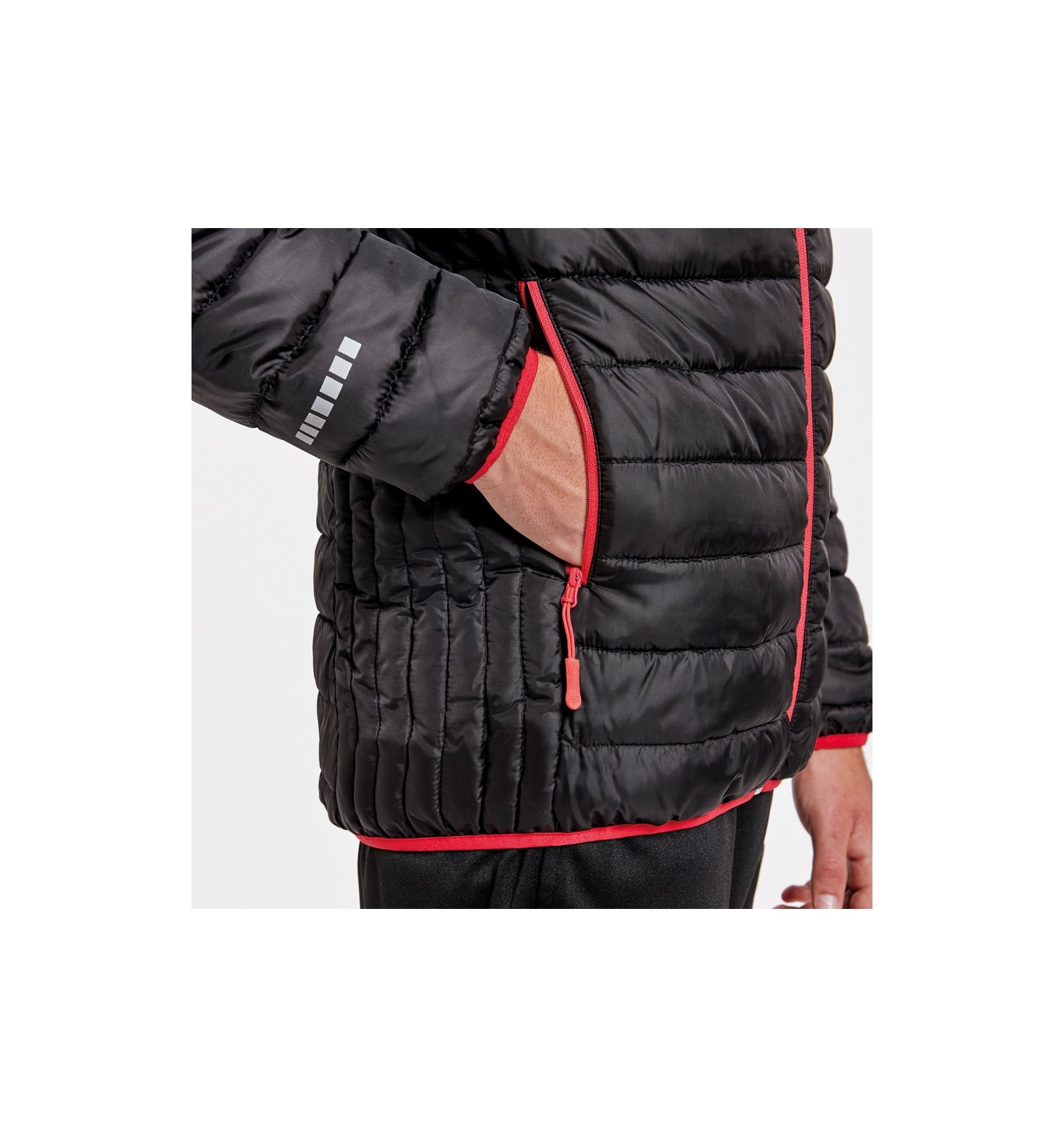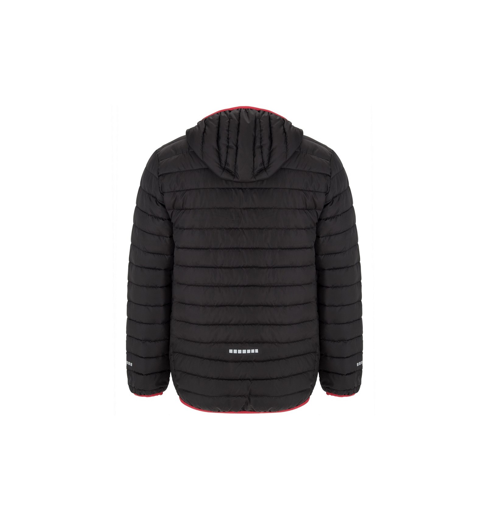 Jachetă sport, matlasată cu umplutură tact pene. 1.- Fermoar inversat cu protector pentru bărbie și cheiță. 2. Glugă fixă. 3. Buzunare laterale în contrast de culoare și cu fermoar inversat și cheiță. 4. Elemente reflectorizante pe mâneci și la spate. 5. 4 cm mai lungă în talie decât modelul NORWAY. 6. Glugă, manșete și talie cu margine elastică în contrast de culoare. 7. Include sac pentru depozitare.