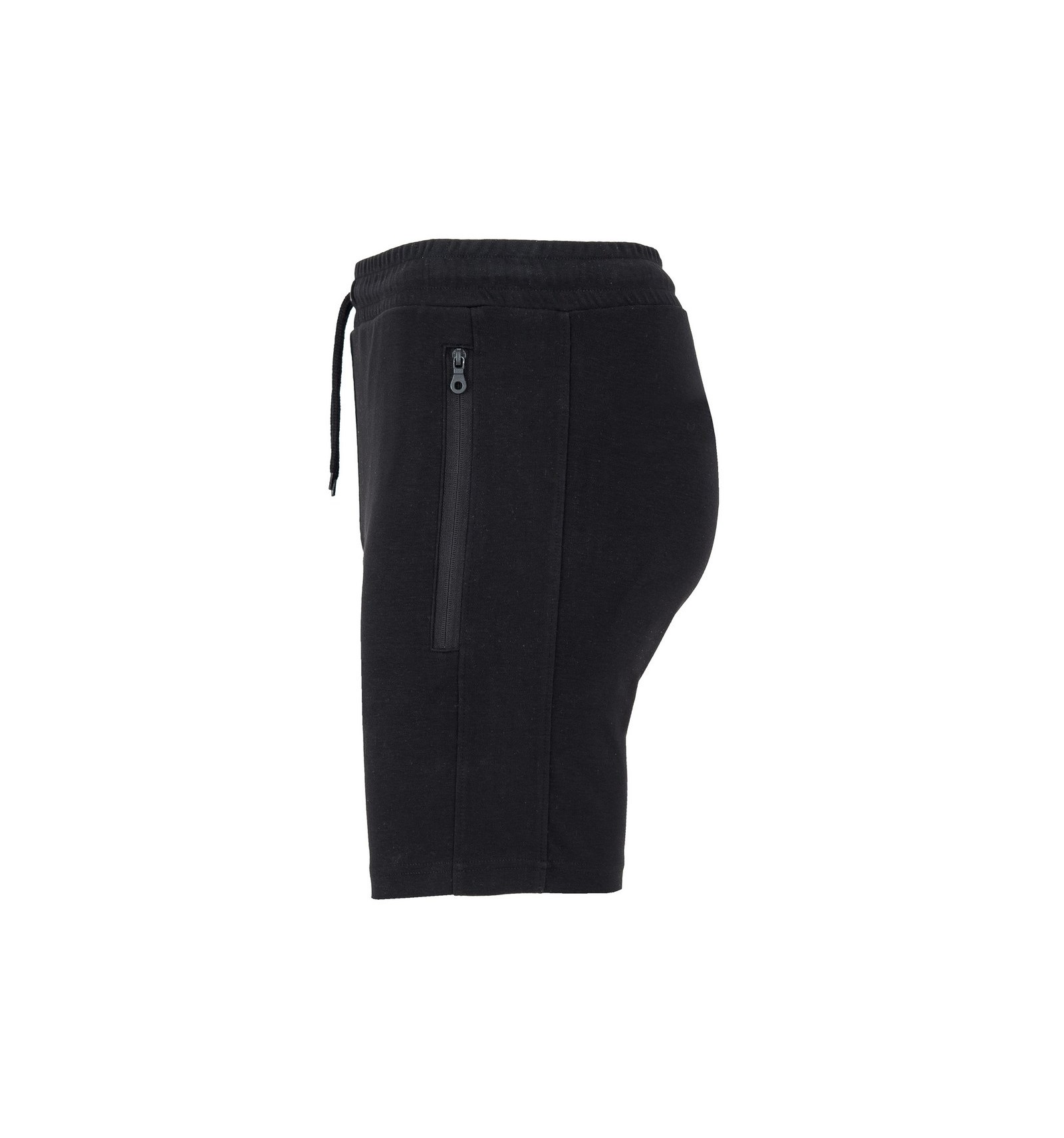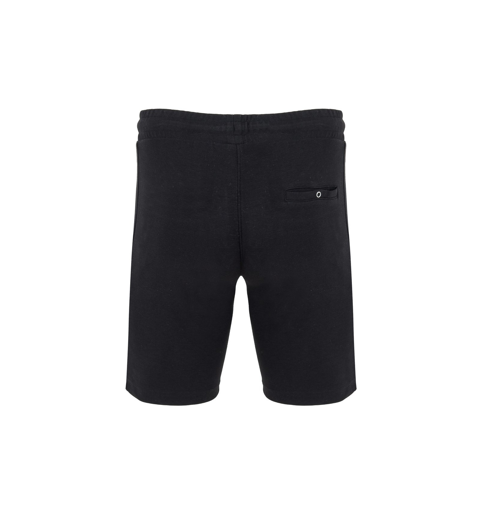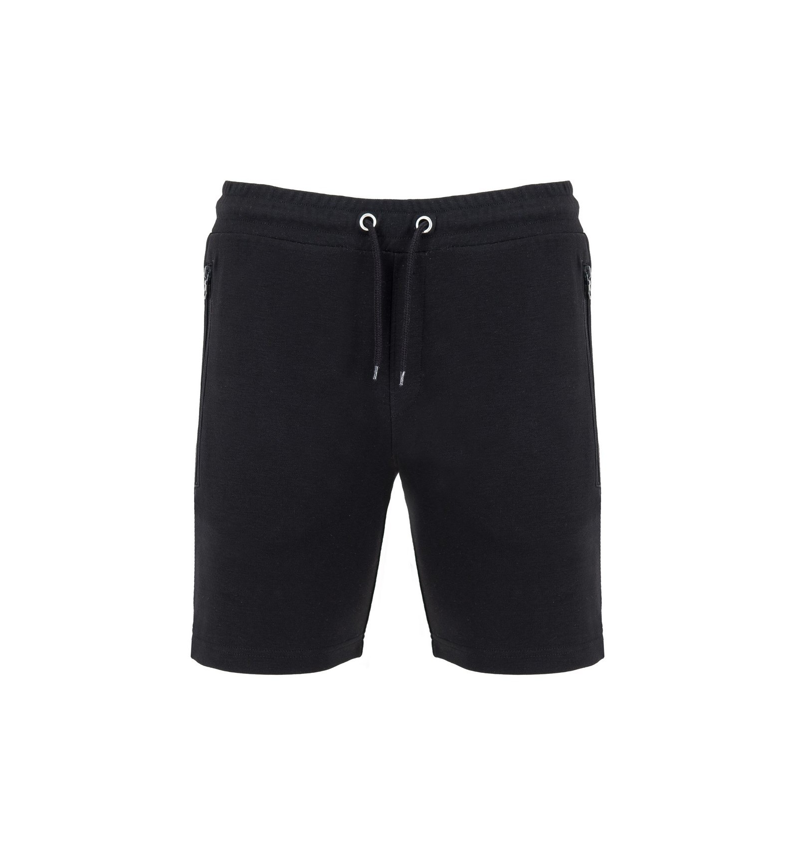 Pantaloni scurți cu betelie elastică și șnur cu butoniere metalice. Două buzunare laterale cu fermoar inversat de aceeași culoare și cheiță. Bandă laterală de aceeași culoare. Șliț simulat. Un buzunar la spate cu capsă.