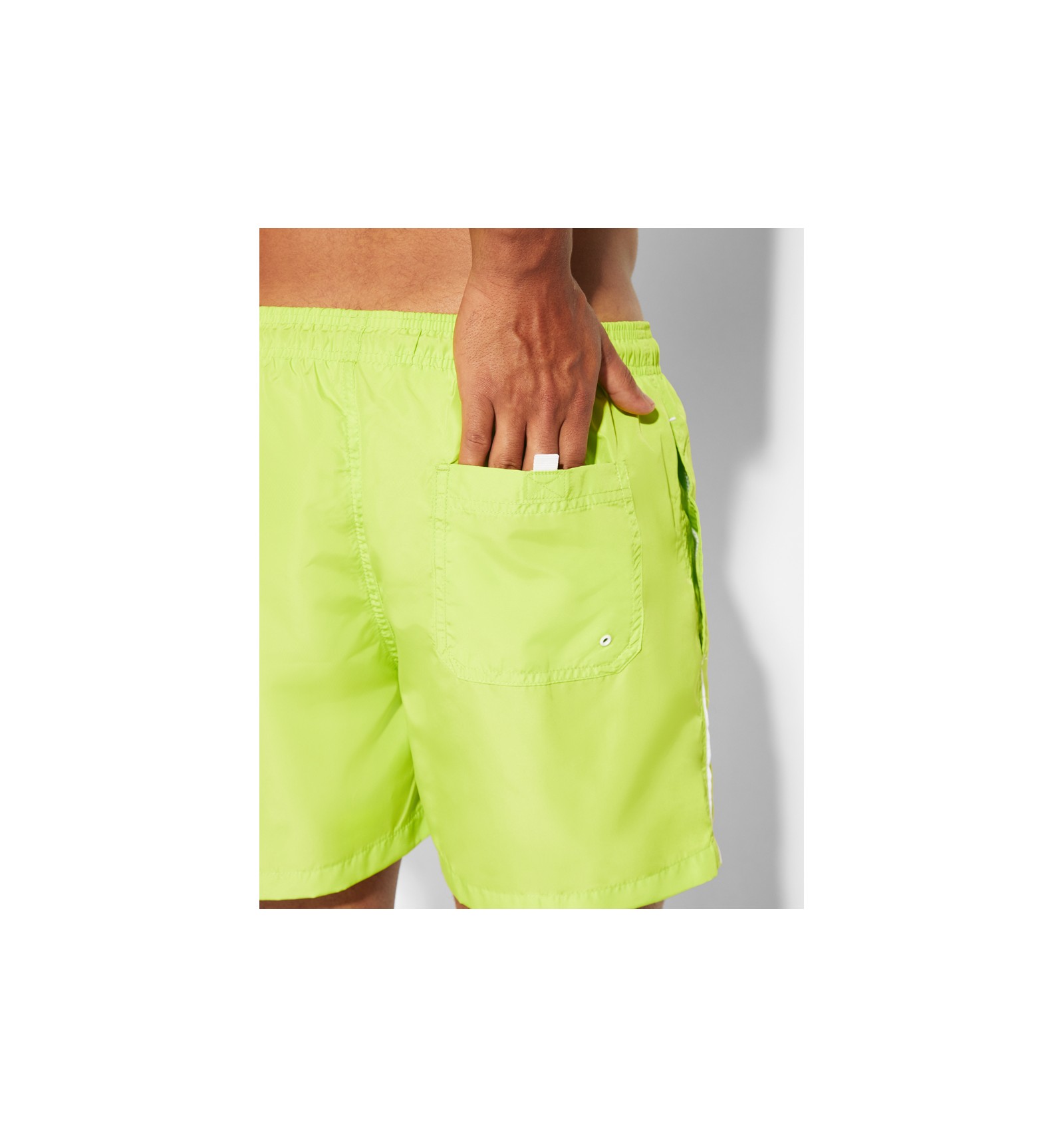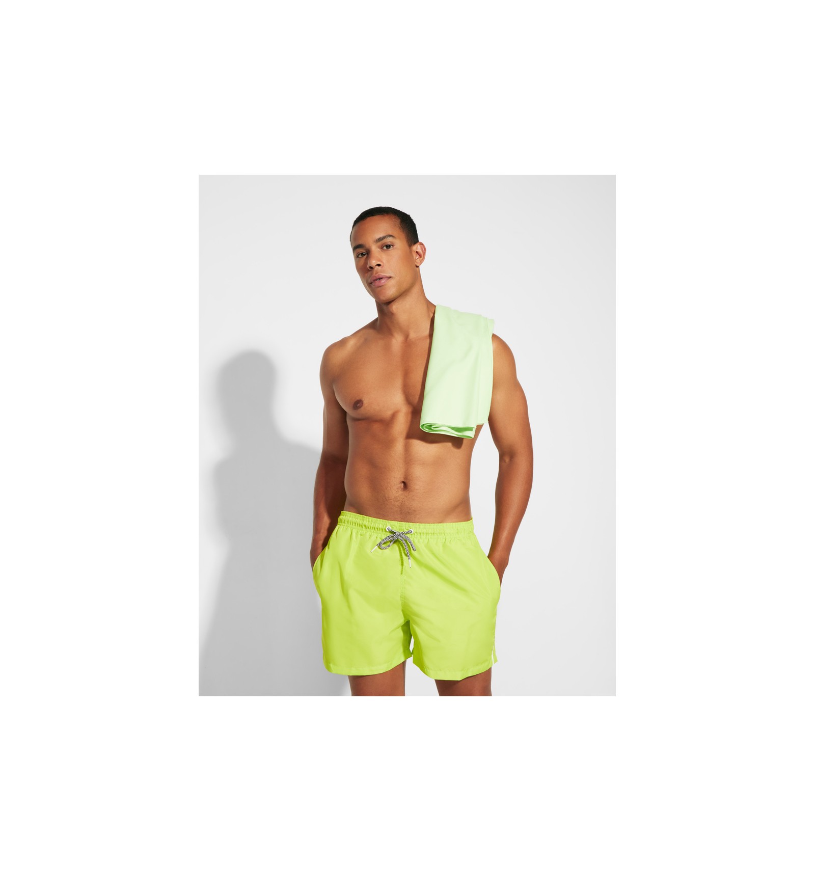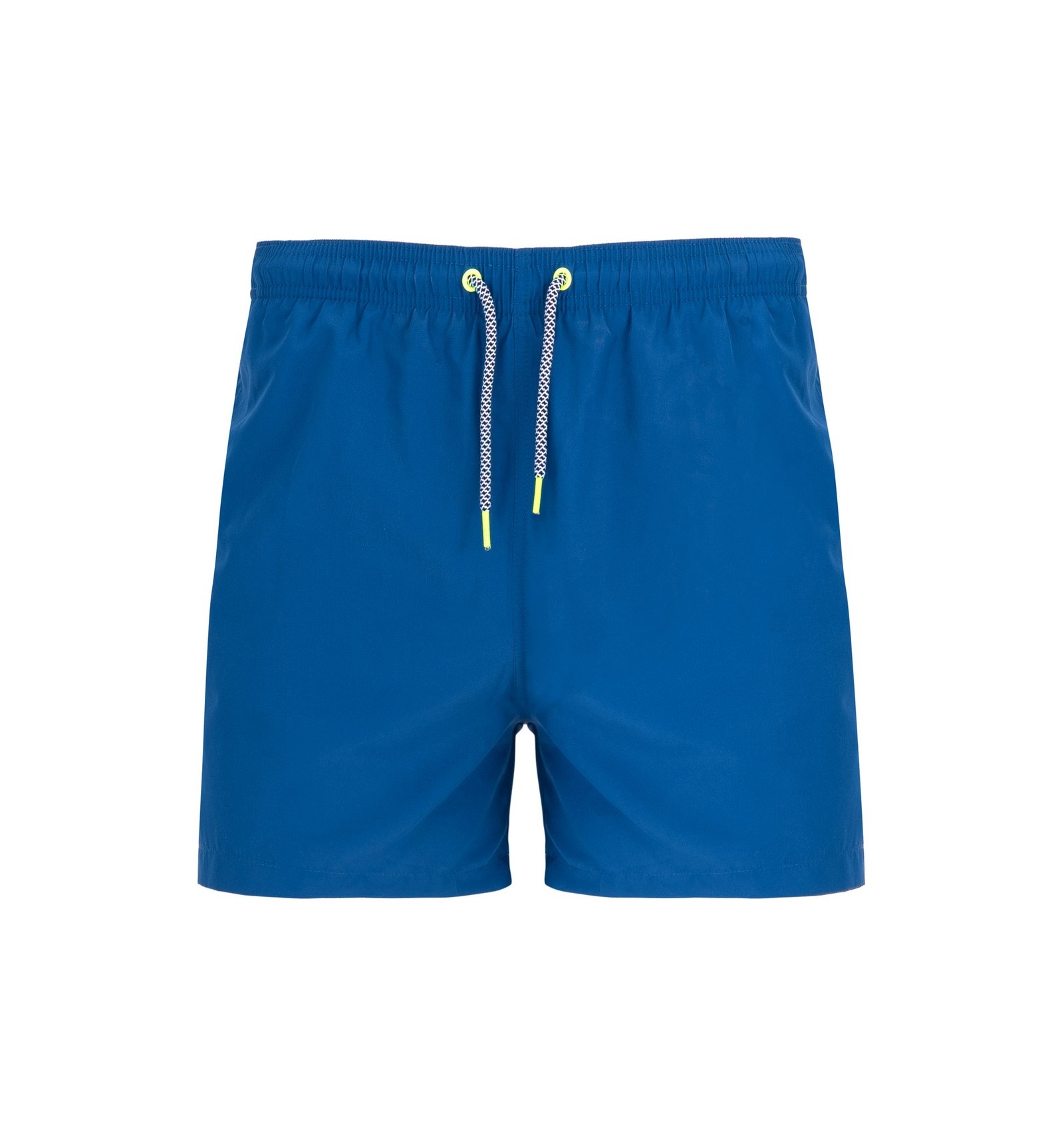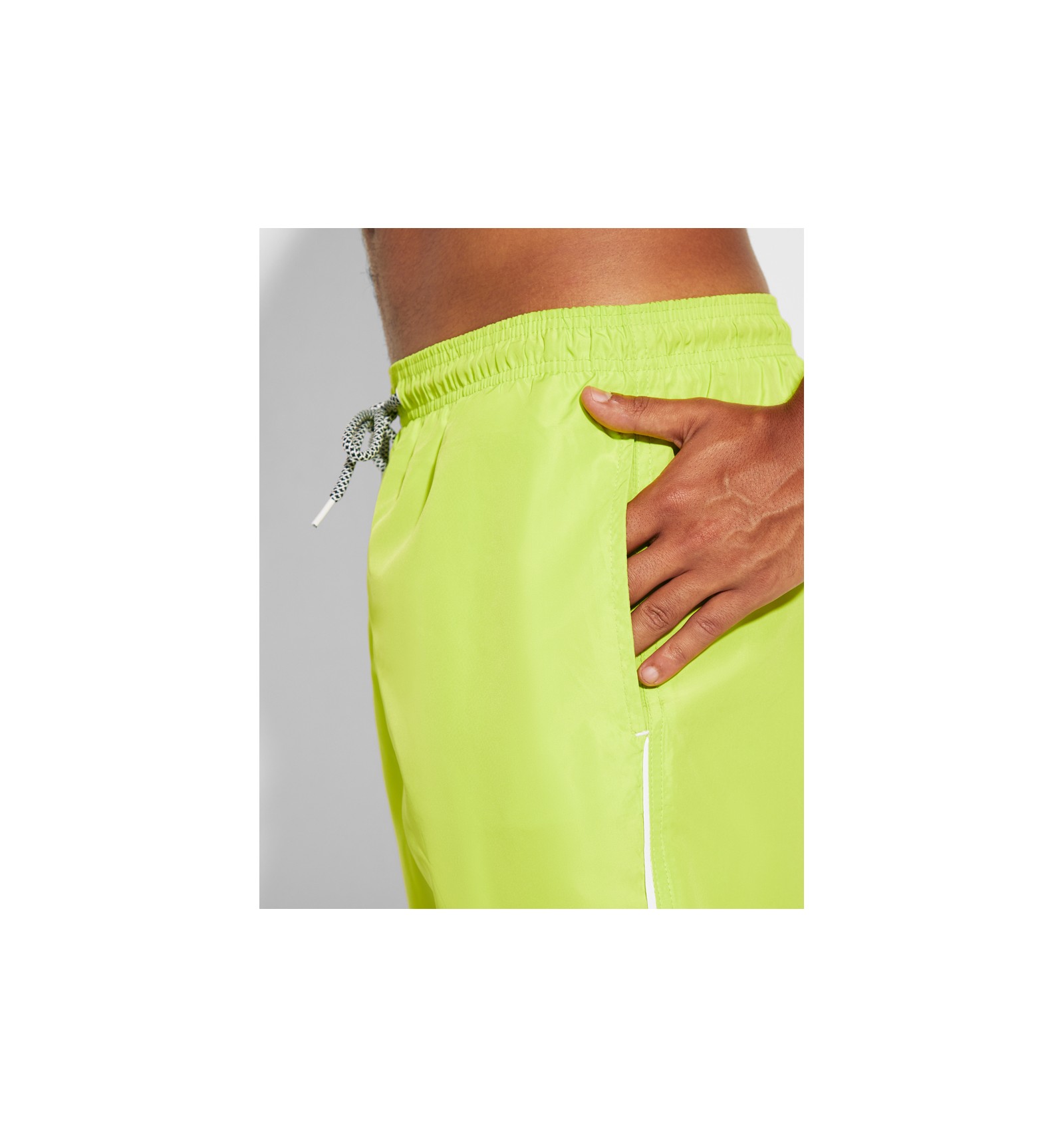 Bermude pentru plajă cu două buzunare laterale. Talie elastică cu șnur decorativ reglabil și butoniere metalice în contrast de culoare. Pe lateral refileți în contrast de culoare. Buzunar la spate cu butonieră pentru scurgerea apei.