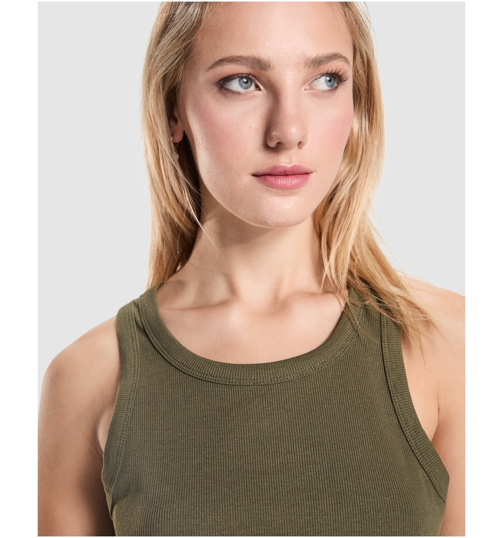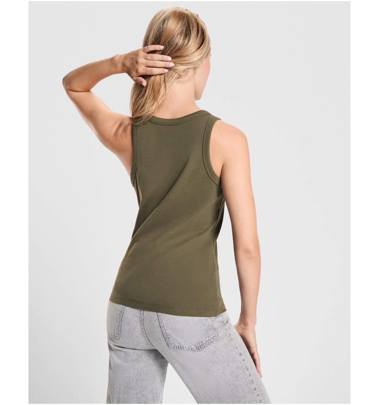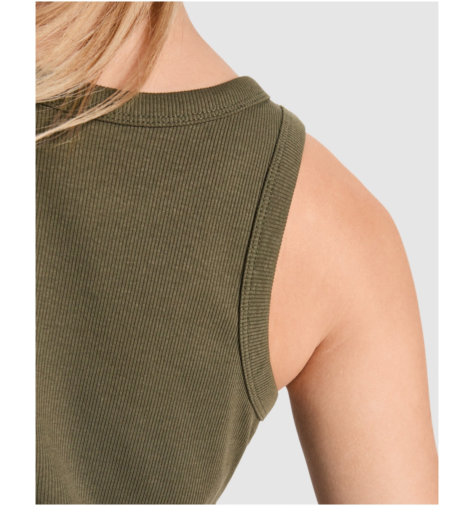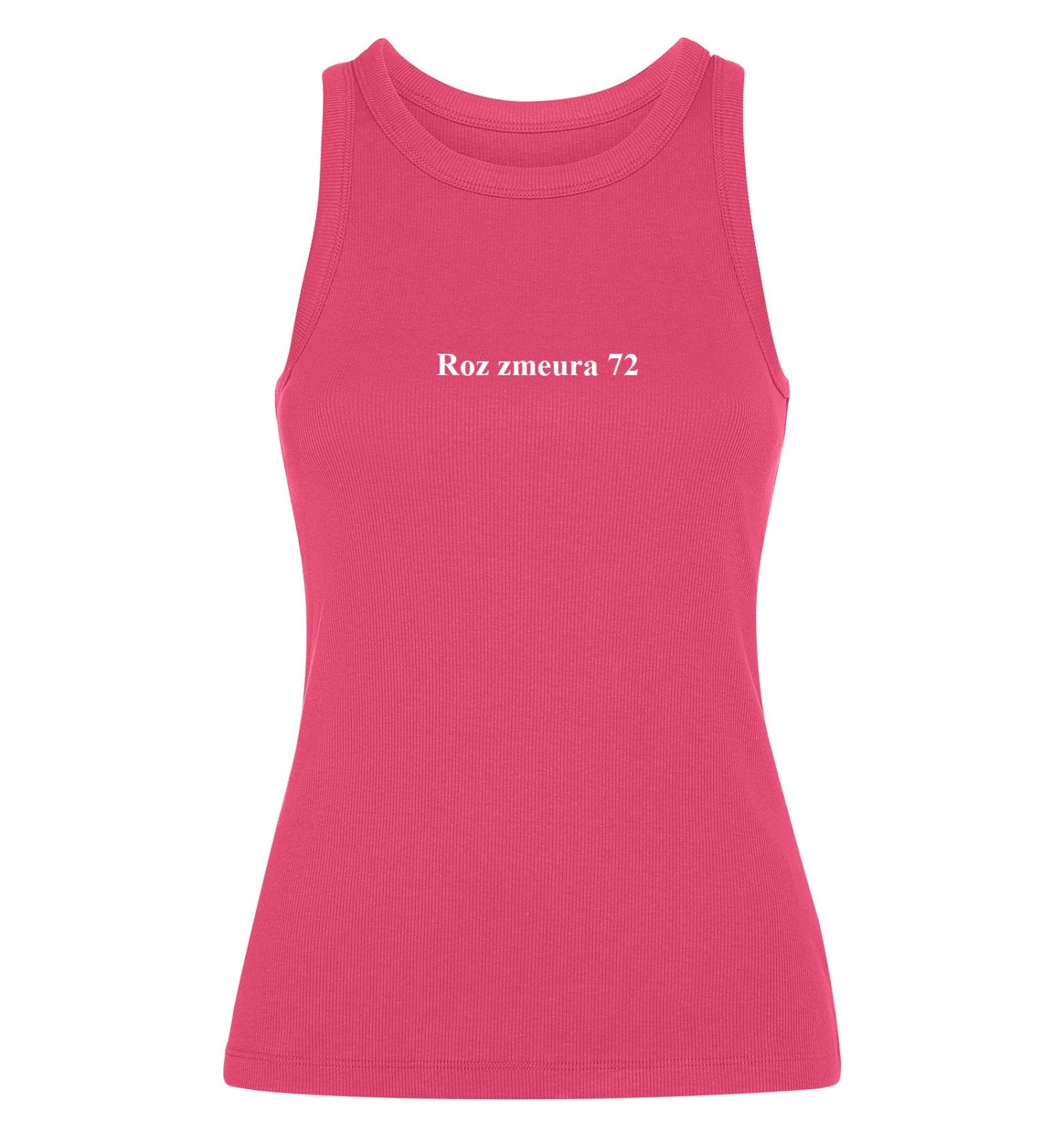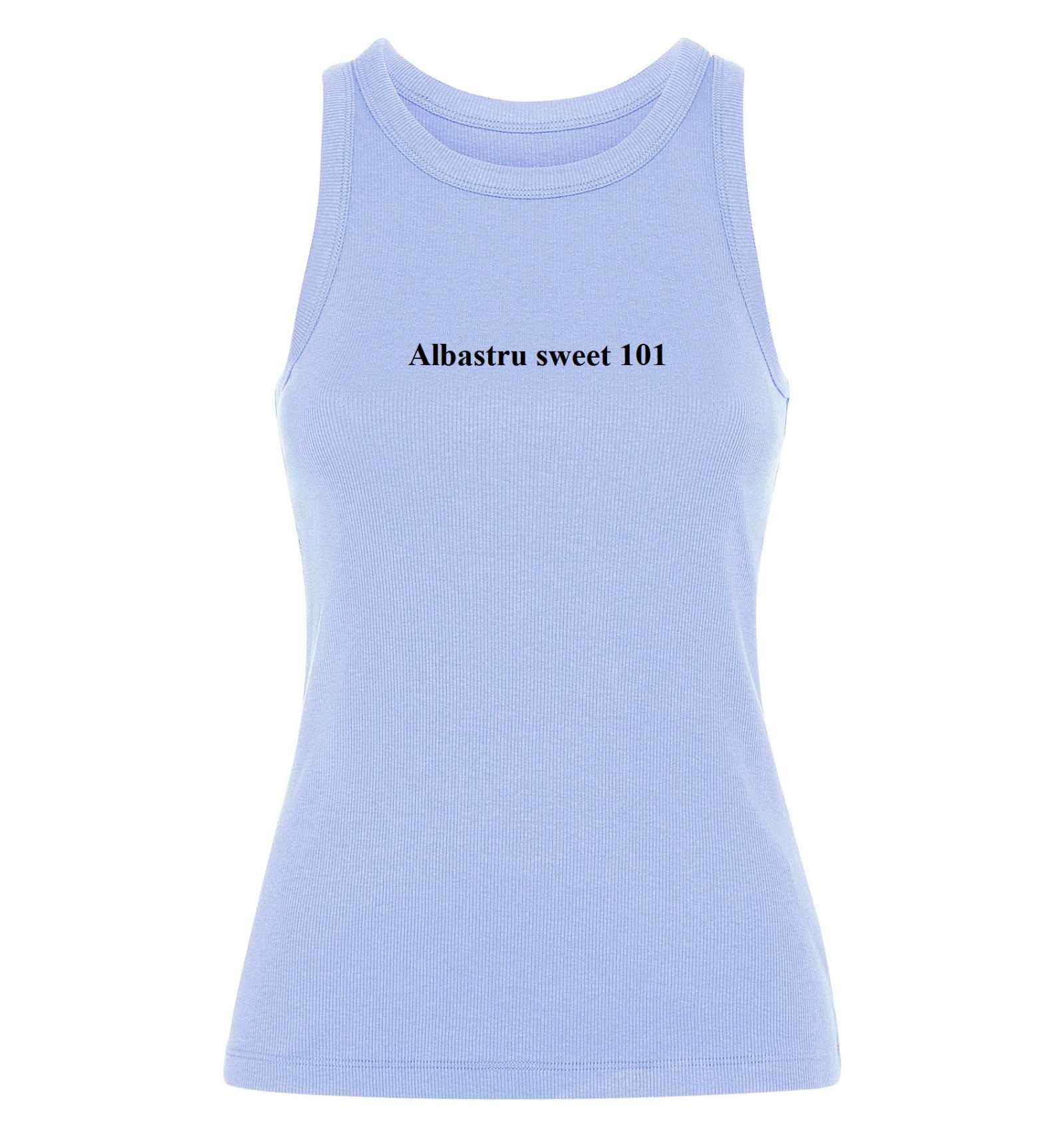 Maiou tricotat cambrat cu nervuri. Guler lat și zonă brațe din același material și întărite cu două cusături. Tiv dublu cusut.