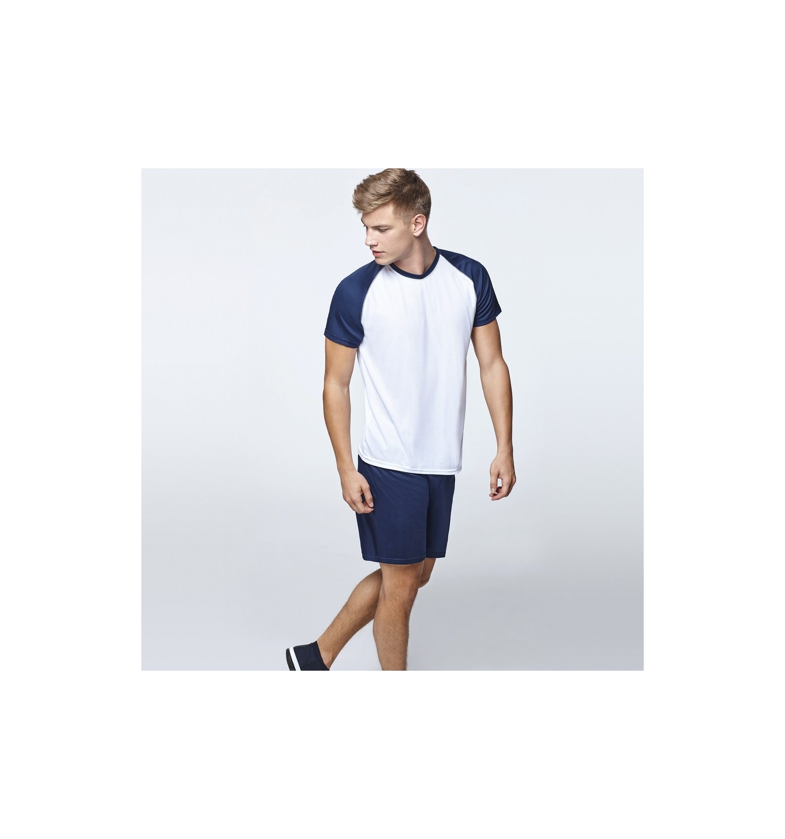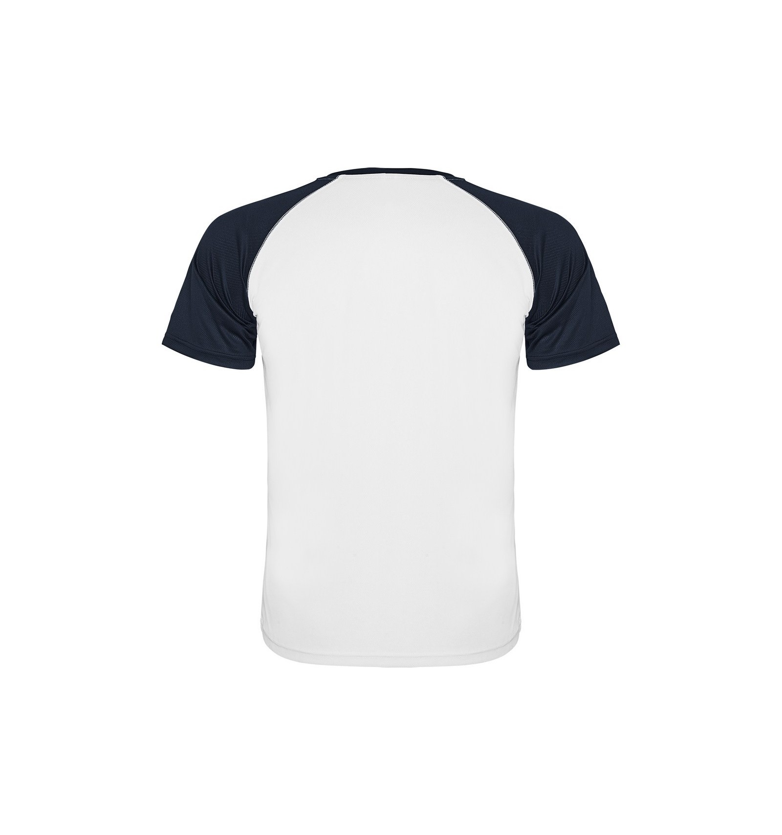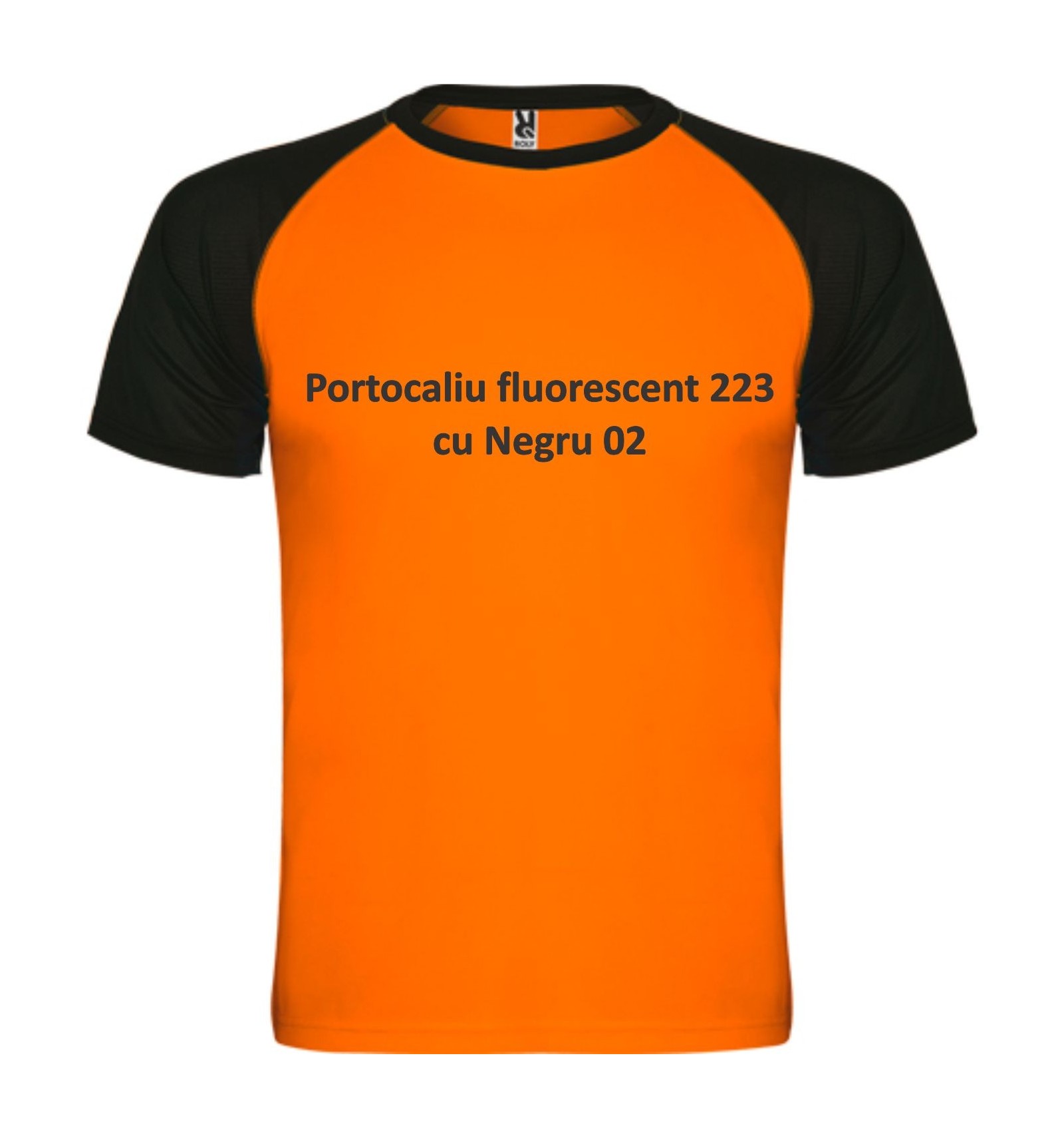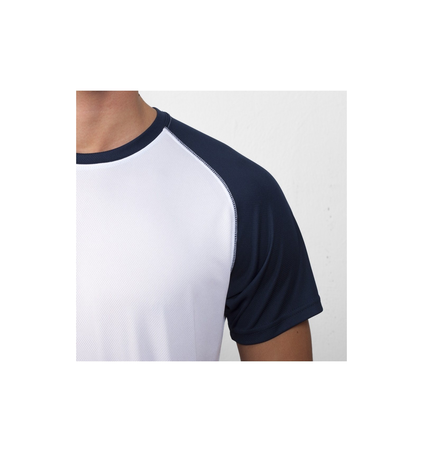 Tricou sport cu mânecă raglan în contrast de culoare. Guler rotund în contrast de culoare și cu bandă întărită pentru acoperirea cusăturilor la interior.