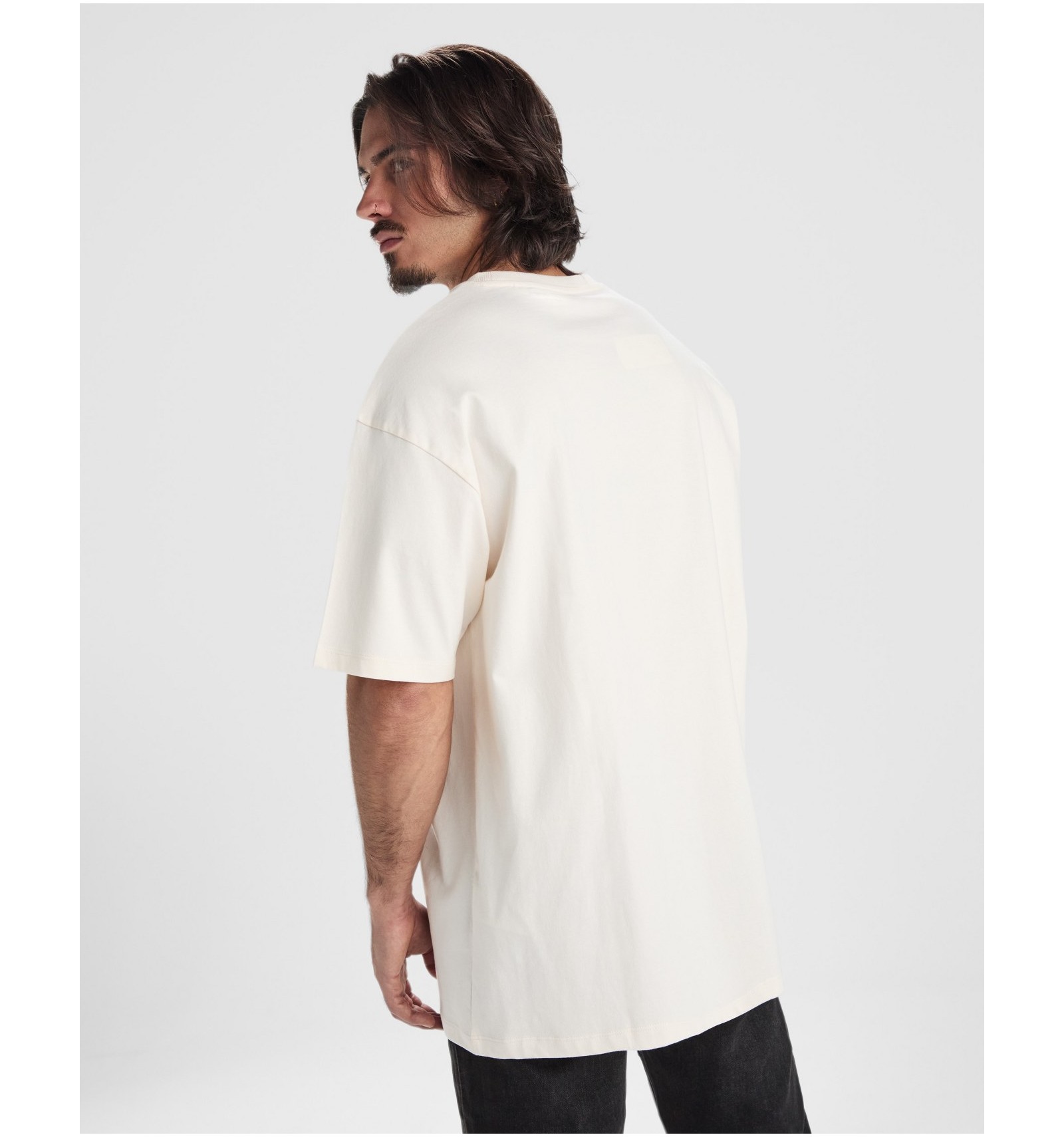 Tricou cu mânecă scurtă în stil oversize. Guler rotund cu rib în canalé 2x1 cu bandă pentru acoperirea cusăturilor în ton asortat. Cusături laterale. Cusături duble late pe mâneci și tiv.