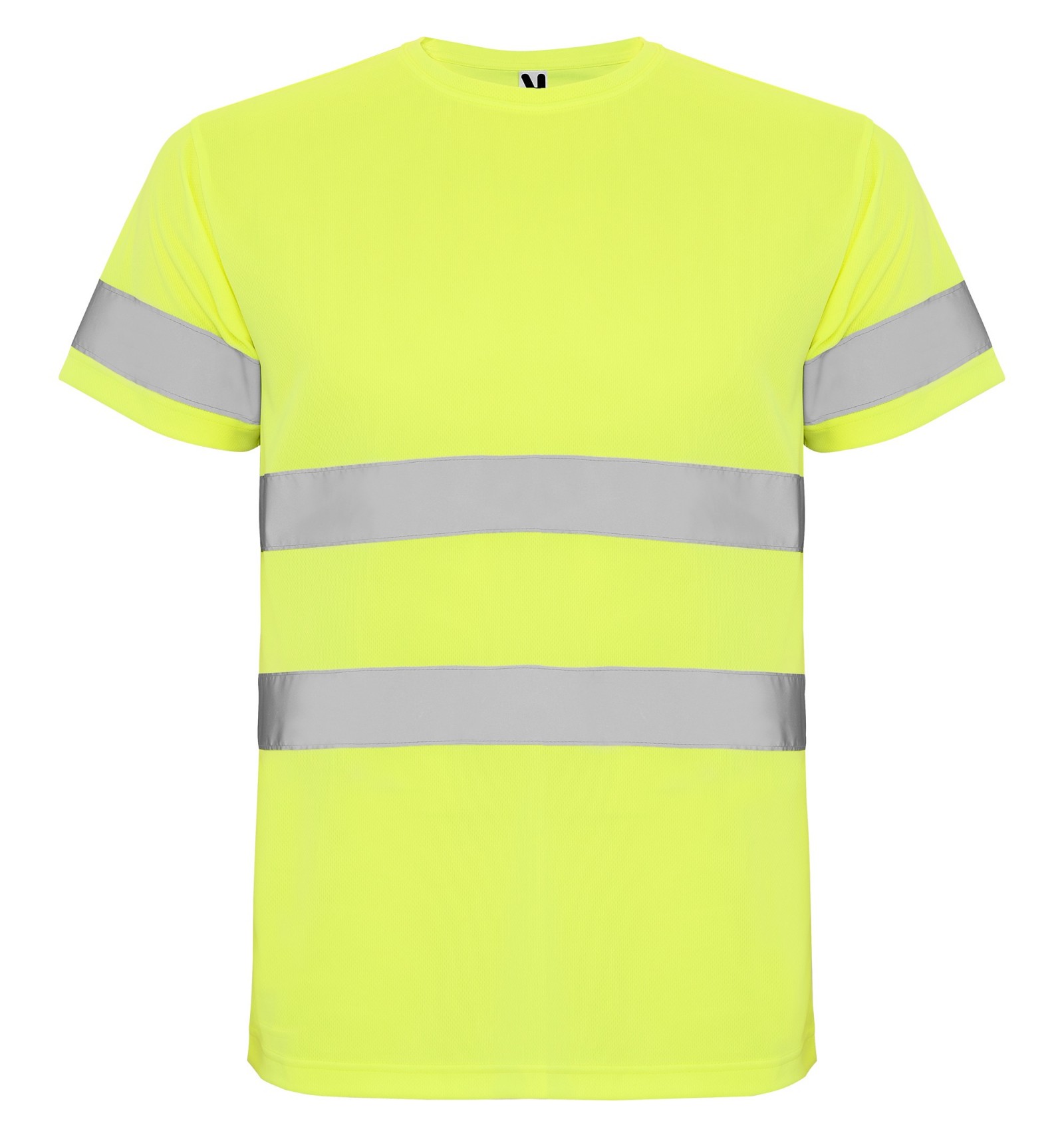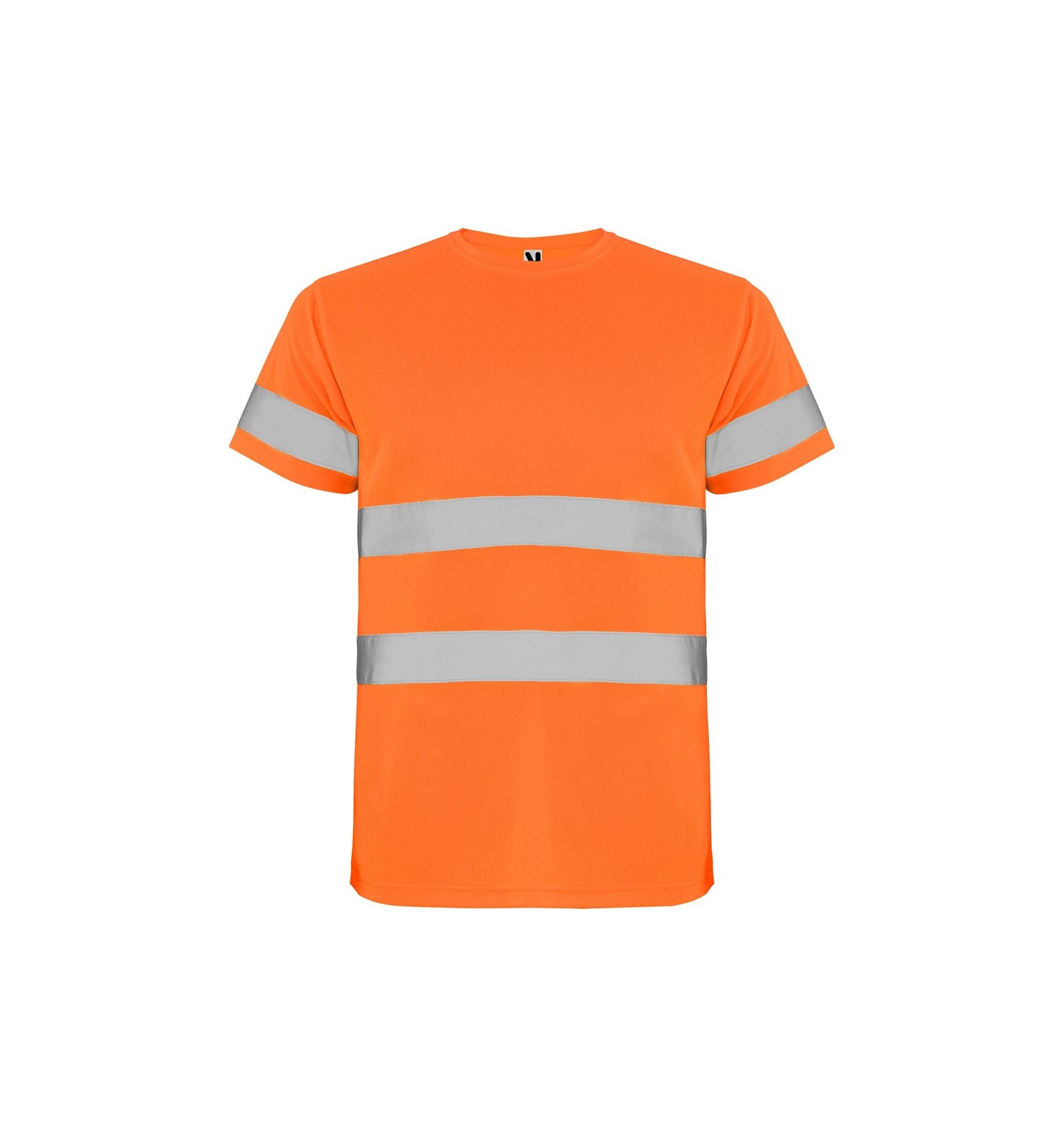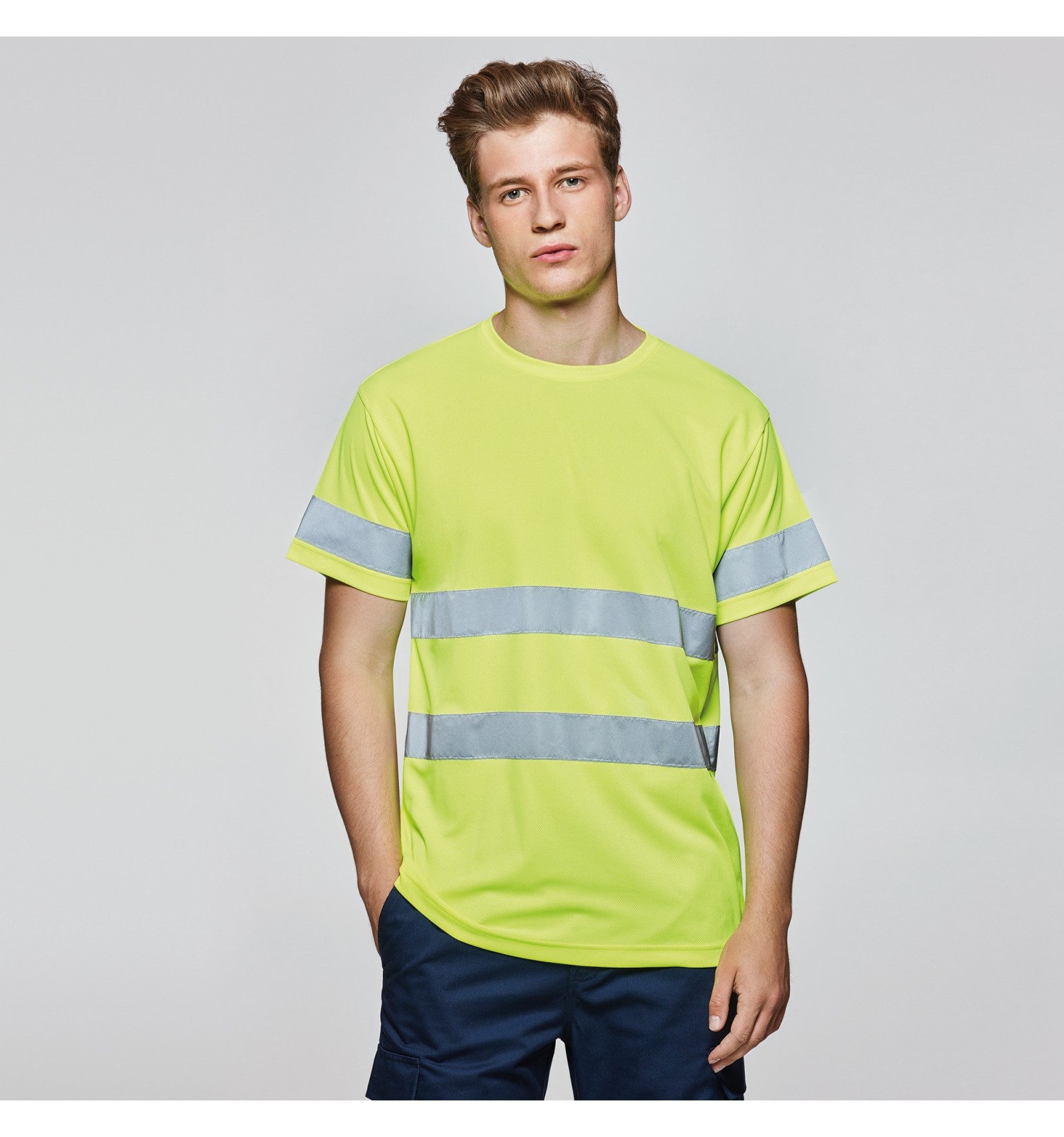 Tricou tehnic cu mânecă scurtă de vizibilitate ridicată. Guler rotund din același material cu bandă întărită pentru acoperirea cusăturilor la interior. Două benzi reflectorizante pe corp și una la mâneci.