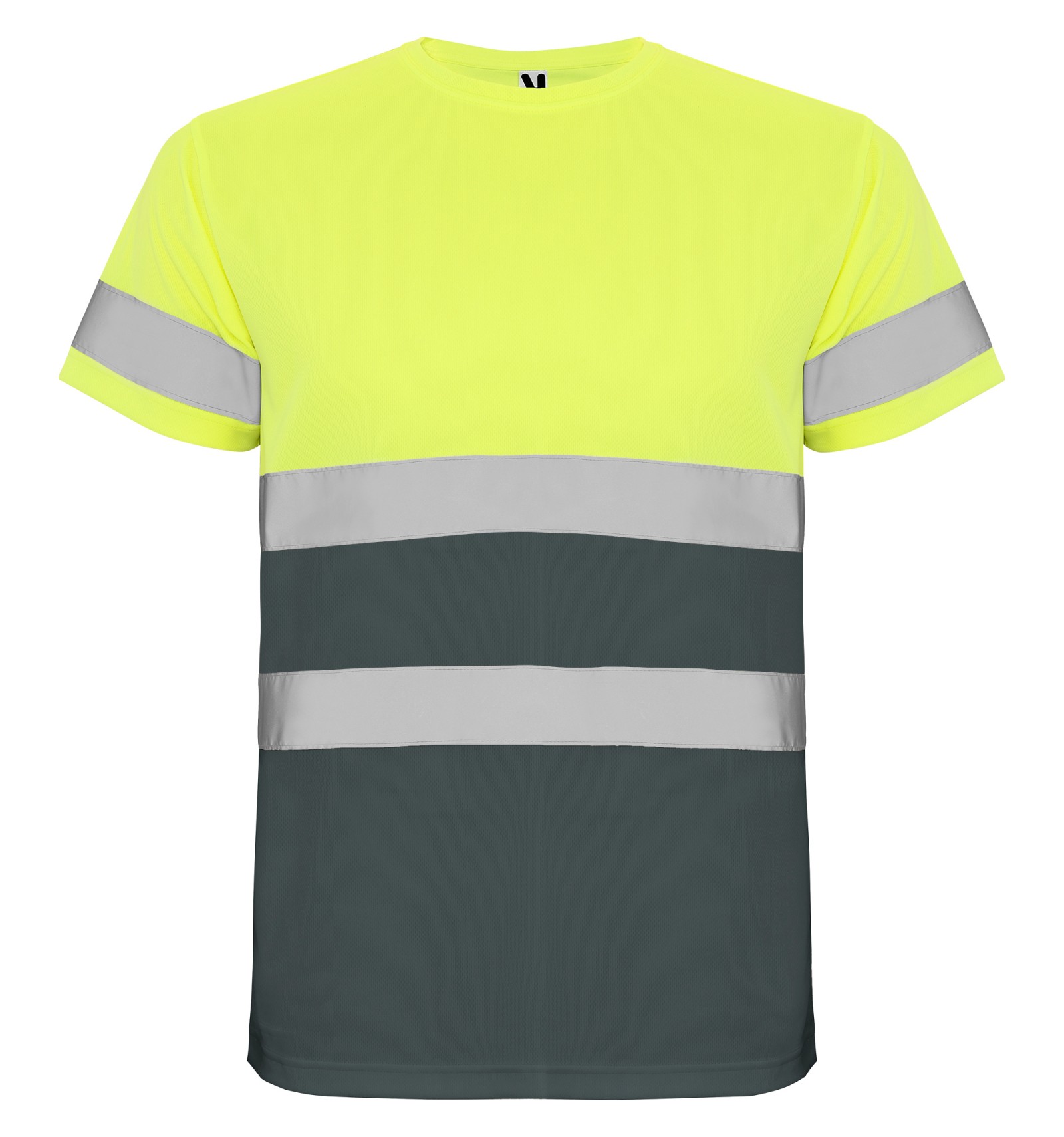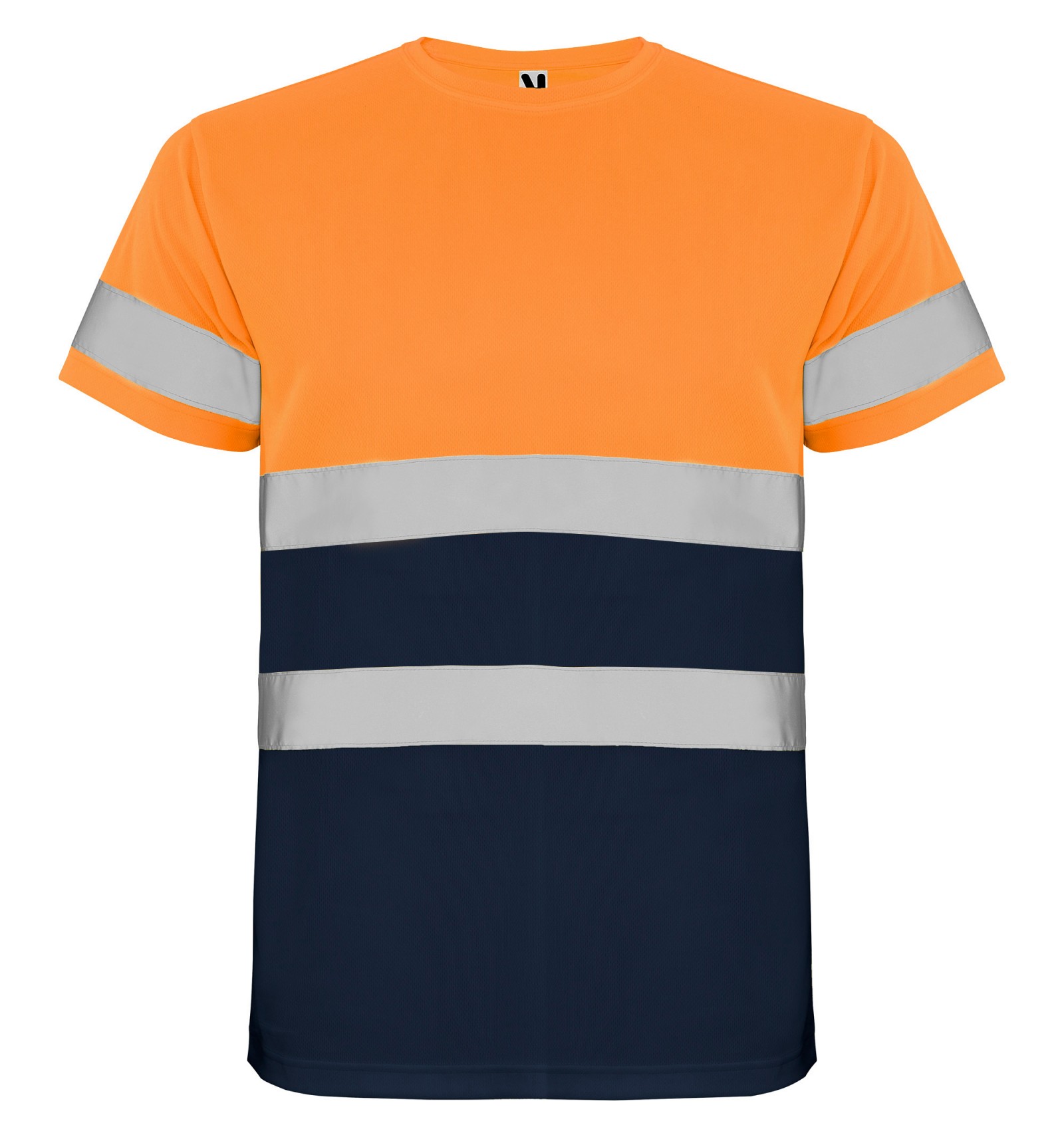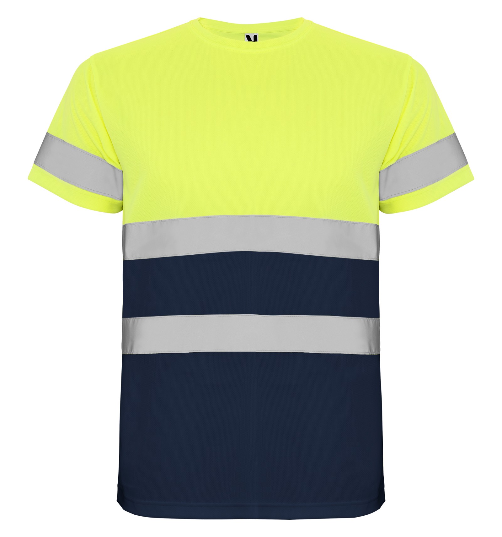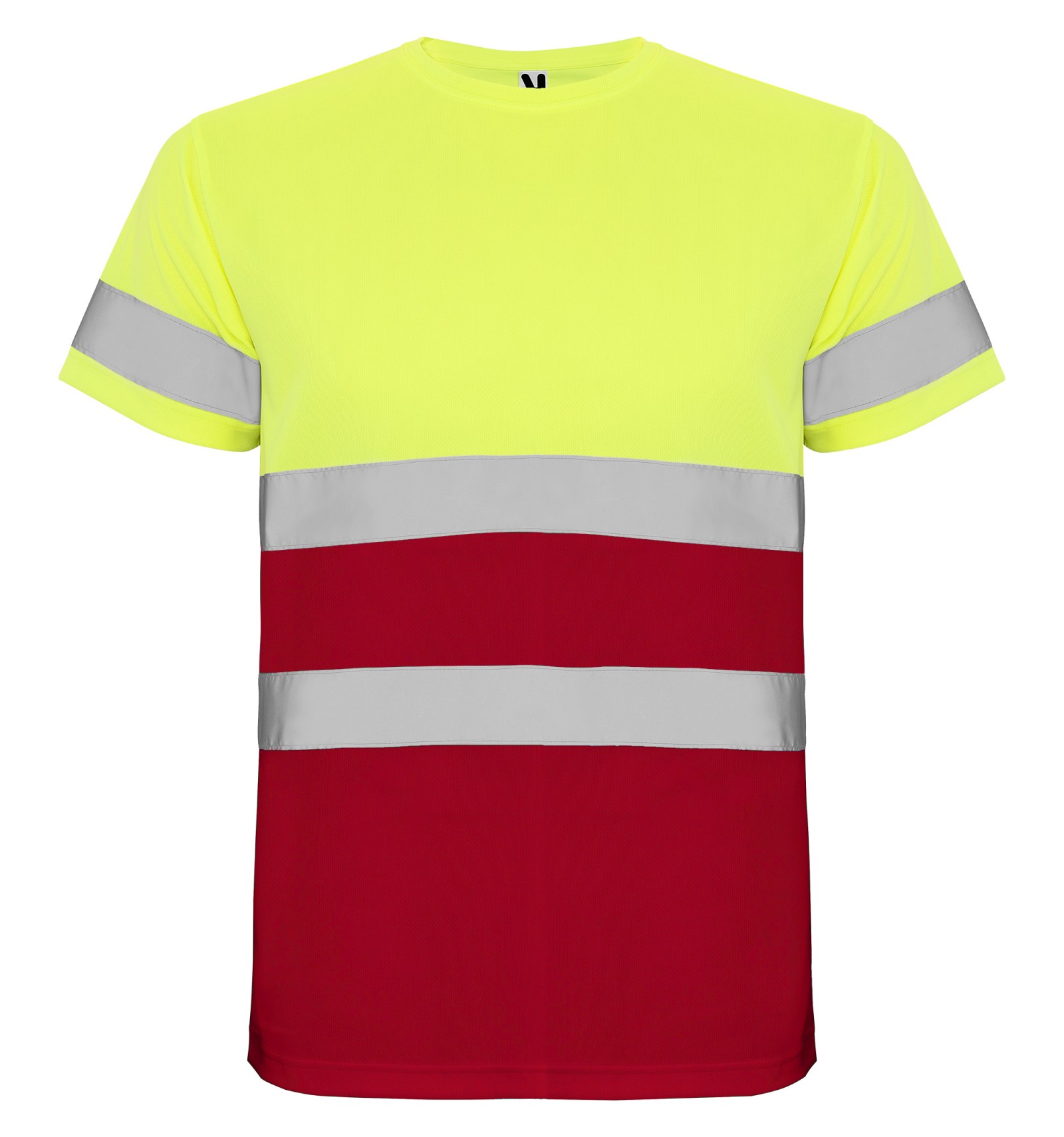 Tricou tehnic cu mânecă scurtă de vizibilitate ridicată. Guler rotund din același material cu bandă întărită pentru acoperirea cusăturilor la interior. Două benzi reflectorizante pe corp și una la mâneci.