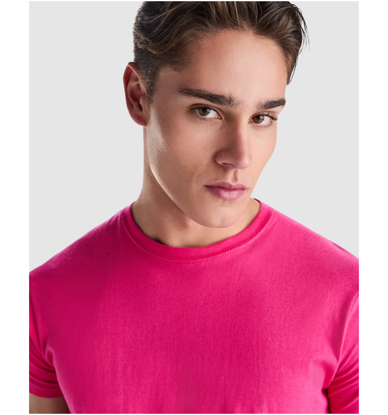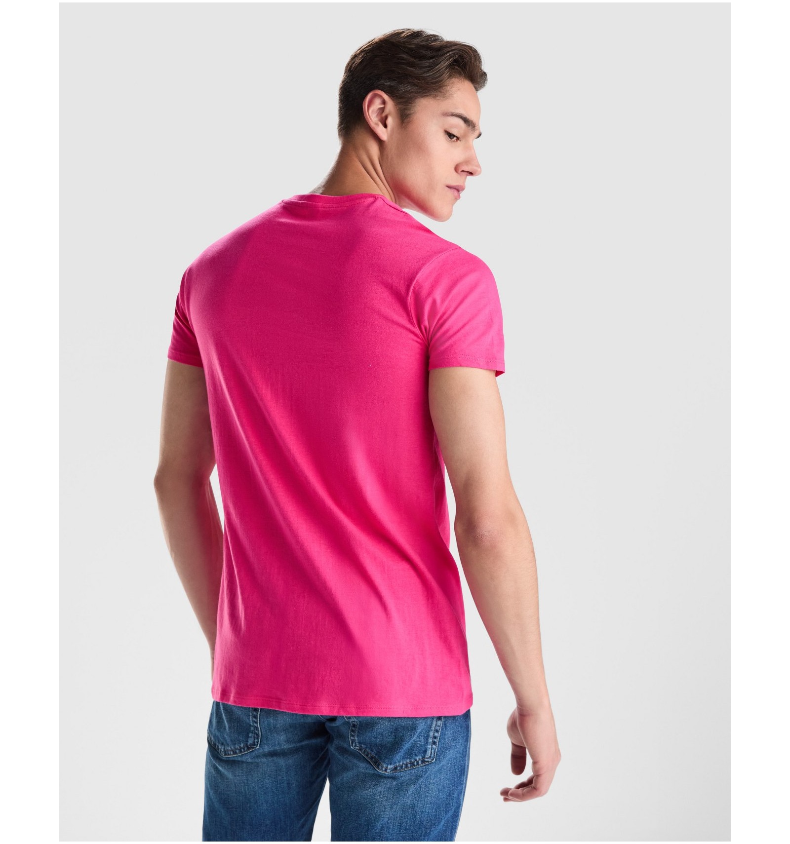 Tricou cu mânecă scurtă, guler rotund dublu. Cu bandă întărită pentru acoperirea cusăturii la guler și umeri, fără cusături.