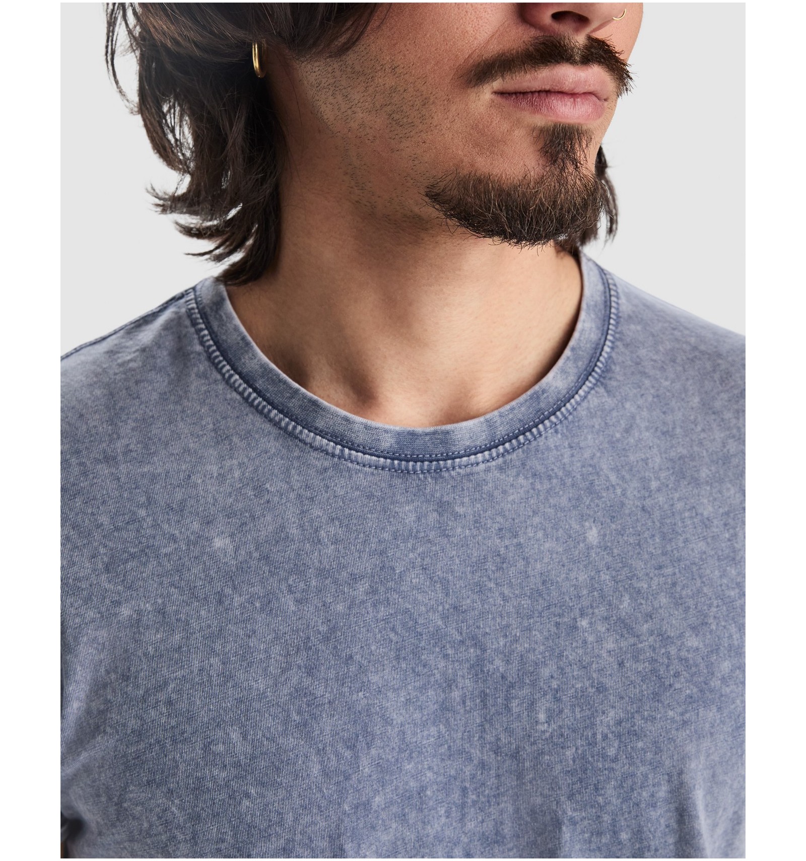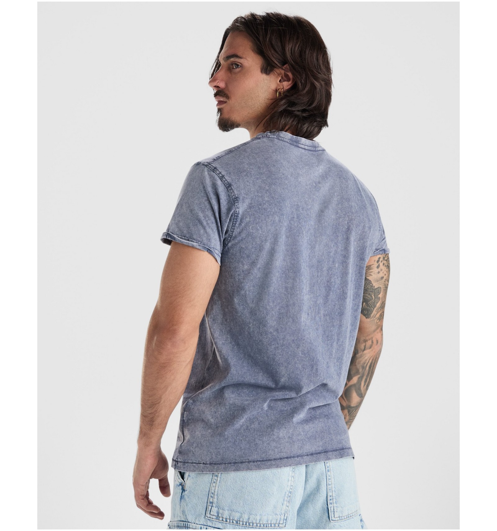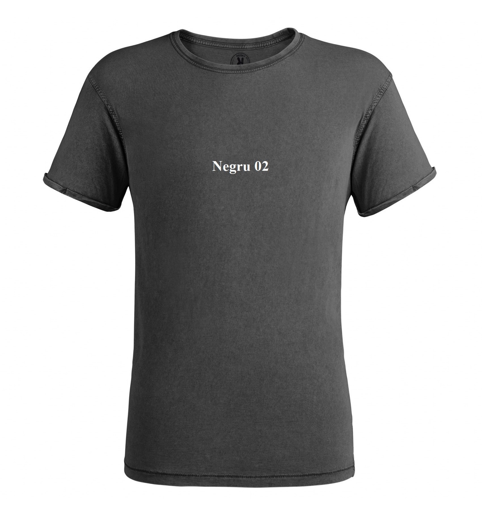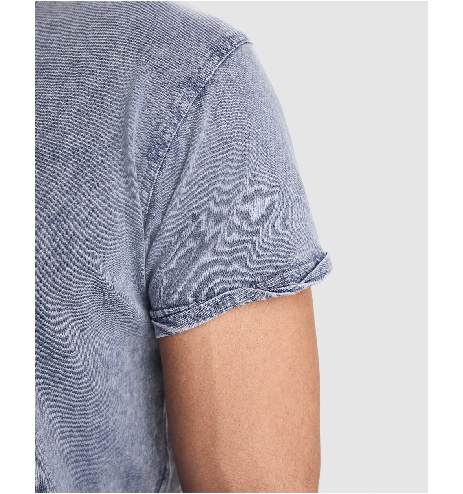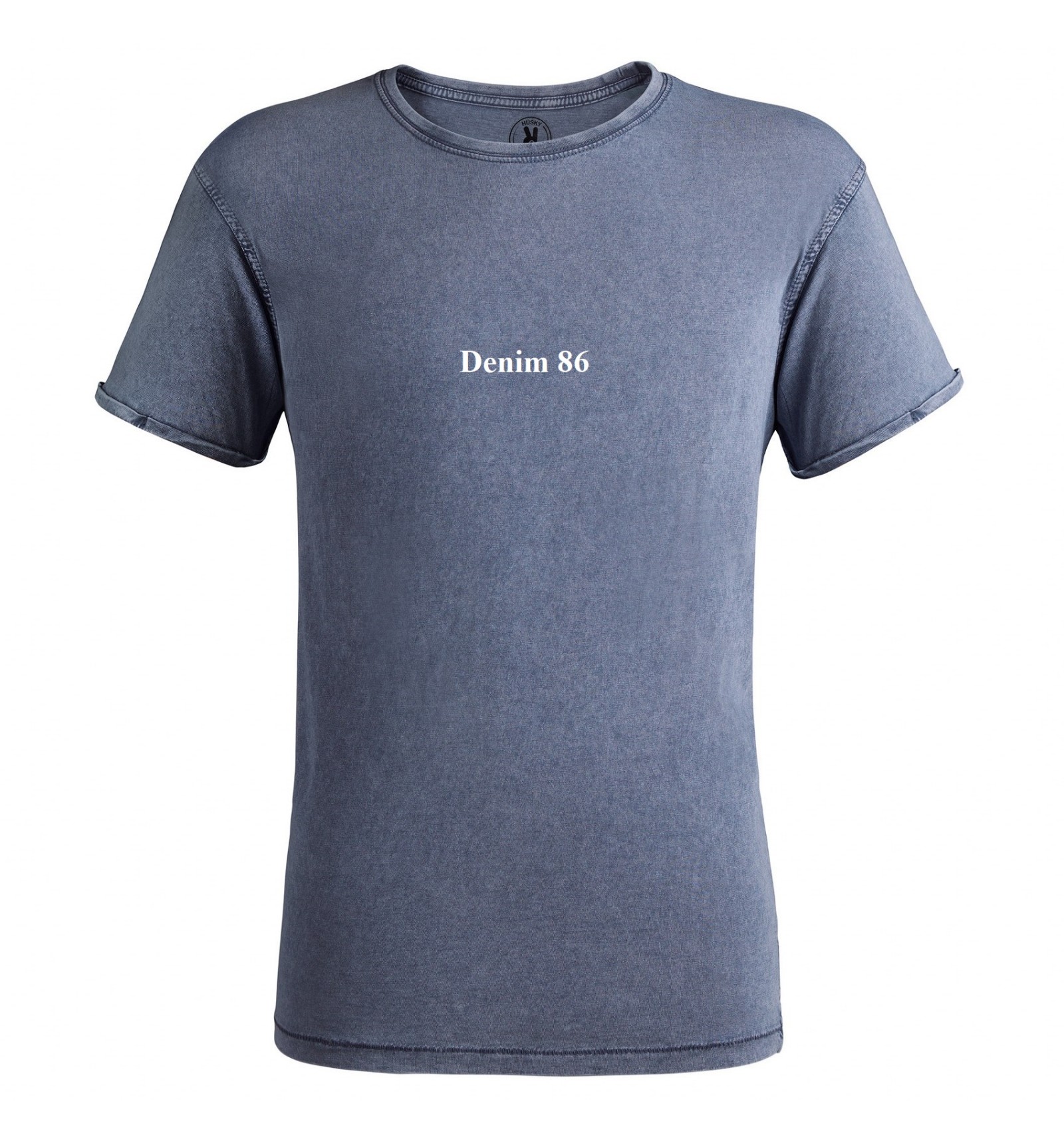 Tricou cu mânecă scurtă cu efect de jeans. Guler rotund în canalé 1x1, cu bandă întărită pentru acoperirea cusăturilor la interior. Cusături duble la subraț. Manșeta cu tiv întors.