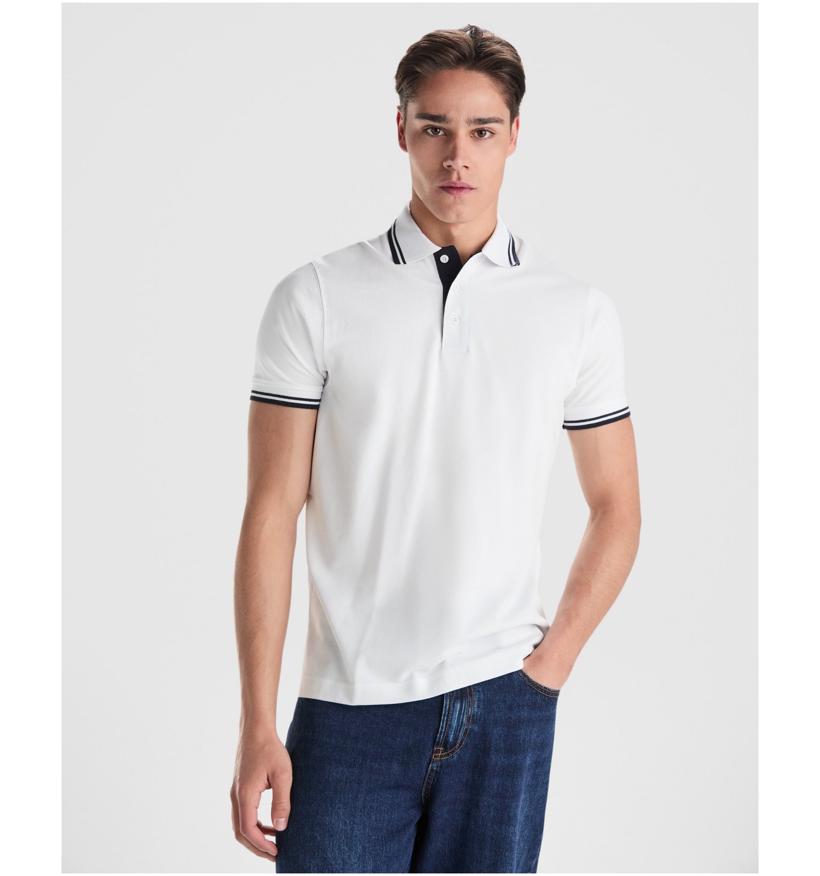 Tricou polo cu mânecă scurtă, guler cu fantă de 3 nasturi de aceeași culoare. Fantă interioară în contrast cu cea exterioară. Guler și manșete canelate, bandă întărită pentru acoperirea cusăturii la guler. Șlițuri laterale.